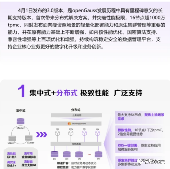 看到我不相信,同事给我拿来一篇新闻报道里面写了16节点1000万TPMC,妥妥的分布式架构啊。难道华为在3.0里发了大招了?于是我立马下载了一套OpenGauss 3.0的官方文档翻了起来。