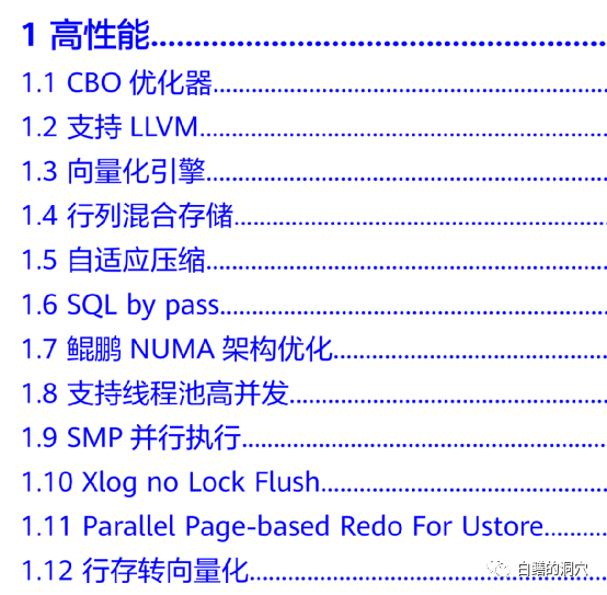 华为还是舍得在研发上投入的,虽然openGauss脱胎于PostgreSQL 9.2.4这个早期版本,不过openGauss在功能特性上与原生态的PG已经有了相当大的不同,在华为的《特性描述手册》里可以看到很多令人兴奋的功能特性。