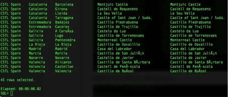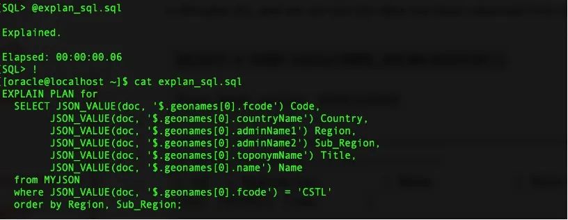 SELECT JSON_VALUE(doc, '$.geonames[0].fcode') Code,JSON_VALUE(doc, '$.geonames[0].countryName') Country,JSON_VALUE(doc, '$.geonames[0].adminName1') Region,JSON_VALUE(doc, '$.geonames[0].adminName2') Sub_Region,JSON_VALUE(doc, '$.geonames[0].toponymName') Title,JSON_VALUE(doc, '$.geonames[0].name') Namefrom MYJSONwhere JSON_VALUE(doc, '$.geonames[0].fcode') = 'CSTL'order by Region, Sub_Region;
