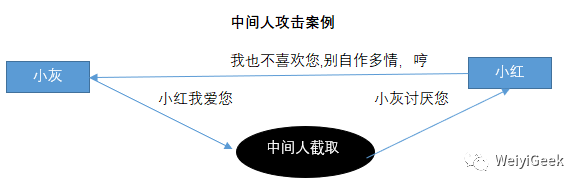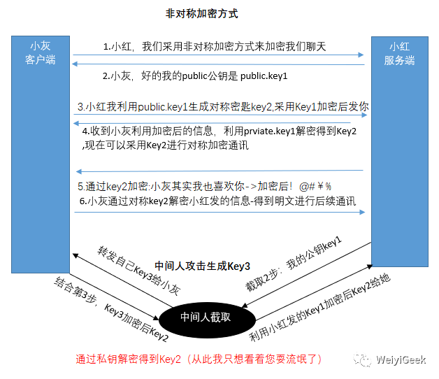中间人虽然不知道小红的私钥是什么,但是第一次通讯中截获了小红的公钥Key1之后,却可以偷天换日,自己另外生成一对公钥私钥把自己的公钥Key3发送给小灰。