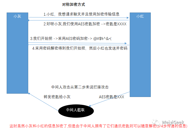 方式1:采用对称加密方式描述:小灰和小红可以事先约定一种对称加密方式,并且约定一个随机生成的密钥。后续的通信中,信息发送方都使用密钥对信息加密,而信息接收方通过同样的密钥对信息解密。该种方式缺陷: 因为第一次约定加密方式和密钥的通信仍然是明文,如果第一次通信就已经被拦截了,那么密钥就会泄露给中间人中间人仍然可以解密后续所有的通信内容。