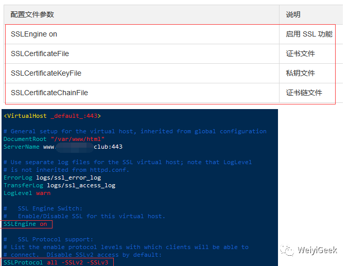 <VirtualHost _default_:443>DocumentRoot "/var/www/html"ServerName www.weiyi.top:443ErrorLog logs/ssl_error_logTransferLog logs/ssl_access_logLogLevel warnSSLEngine onSSLProtocol all -SSLv2 -SSLv3SSLCipherSuite HIGH:3DES:!aNULL:!MD5:!SEED:!IDEA:!RC4:!DH4SSLCertificateFile usr/local/httpd/cert/2_sss.club.crtSSLCertificateKeyFile usr/local/httpd/cert/3_sss.club.keySSLCertificateChainFile usr/local/httpd/cert/1_root_bundle.crt
