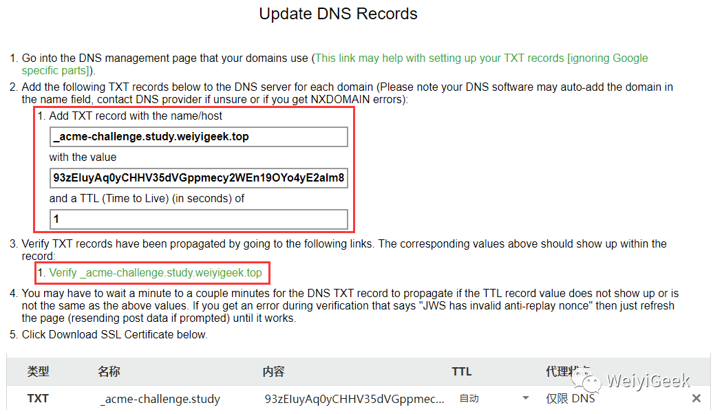 即证书颁布机构只对域名的所有者进行在线检查,通常是验证域名下某个指定文件的内容,或者验证与域名相关的某条 TXT 记录;比如访问 [http|https]😕/www.weiyigeek.top/.../test.txt,文件内容:2016082xxxxxmimvpcom2016或添加一条 TXT 记录:www.weiyigeek.top –> TXT –> 20170xxxxxmimvpcom2066