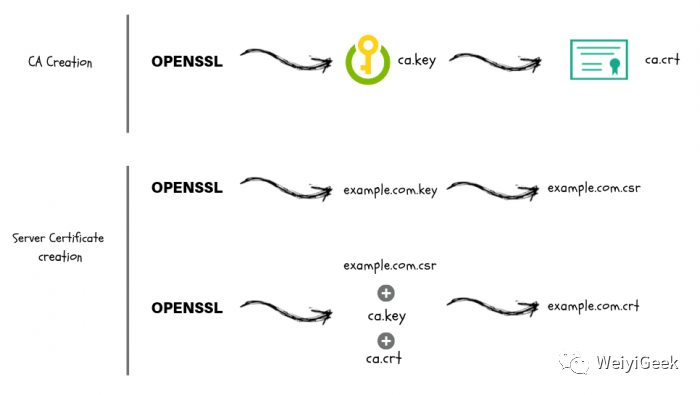 # 1.验证OpenSSL版本openssl version || apt install openssl -y# 2.生成私钥(需输入4位以上密码)# genra 生成RSA私钥# -des3 des3算法# -out server.key 生成的私钥文件名# 2048 私钥长度openssl genrsa -des3 -out server.pass.key 2048# 3.去除私钥中的密码# 注意:有密码的私钥是server.pass.key,没有密码的私钥是server.keyopenssl rsa -in server.pass.key -out server.key# 4.生成CSR(证书签名请求)# req 生成证书签名请求# -new 新生成# -key 私钥文件# -out 生成的CSR文件# -subj 生成CSR证书的参数# -subj 参数说明如下:# 字段 字段含义 示例# C= Country 国家 CN# ST= State or Province 省 Chongqing# L= Location or City 城市 Guangzhou# O= Organization 组织或企业 WeiyiGeek# OU= Organization Unit 部门 WeiyiGeek# CN= Common Name 域名或IP gitlab.WeiyiGeek.topopenssl req -new -key server.key -out server.csr -subj "/C=CN/ST=Chongqing/L=Chongqing/O=xdevops/OU=WeiyiGeek/CN=gitlab.WeiyiGeek.top"# 另外一种方式使用OpenSSL生成带有SubjectAltName的自签名证书# 首先新建一个配置文件 ssl.conf如下cat <<'EOF' > server.conf[ req ]default_bits = 2048distinguished_name = req_distinguished_namereq_extensions = req_ext[ req_distinguished_name ]countryName = Country Name (2 letter code)countryName_default = CNstateOrProvinceName = State or Province Name (full name)stateOrProvinceName_default = ChongQinglocalityName = Locality Name (eg, city)localityName_default = ChongQingorganizationName = Organization Name (eg, company)organizationName_default = weiyigeekcommonName = Common Name (e.g. server FQDN or YOUR name)commonName_max = 64commonName_default = hub.weiyigeek.top[ req_ext ]subjectAltName = @alt_names[alt_names]DNS.1 = weiyigeek.topDNS.2 = hub.weiyigeek.topIP = 10.10.107.201EOFopenssl req -new -sha256 -out server.csr -key server.key -config server.conf# 查看请求签发证书的内容# openssl req -text -noout -in server.csr# 5.生成自签名SSL证书 以及带有 SAN 的SSL证书 (有效期十年)openssl x509 -req -days 3650 -in server.csr -signkey server.key -out gitla.bweiyigeek.top.crtopenssl x509 -req -days 3650 -in server.csr -signkey server.key -out hub.weiyigeek.top.crt -extensions req_ext -extfile server.conf# 6.采用合并的方式获得pem格式证书cat server.crt server.key > server.pem# 7.证书内容查看openssl x509 -text -noout -in hub.weiyigeek.top.crt