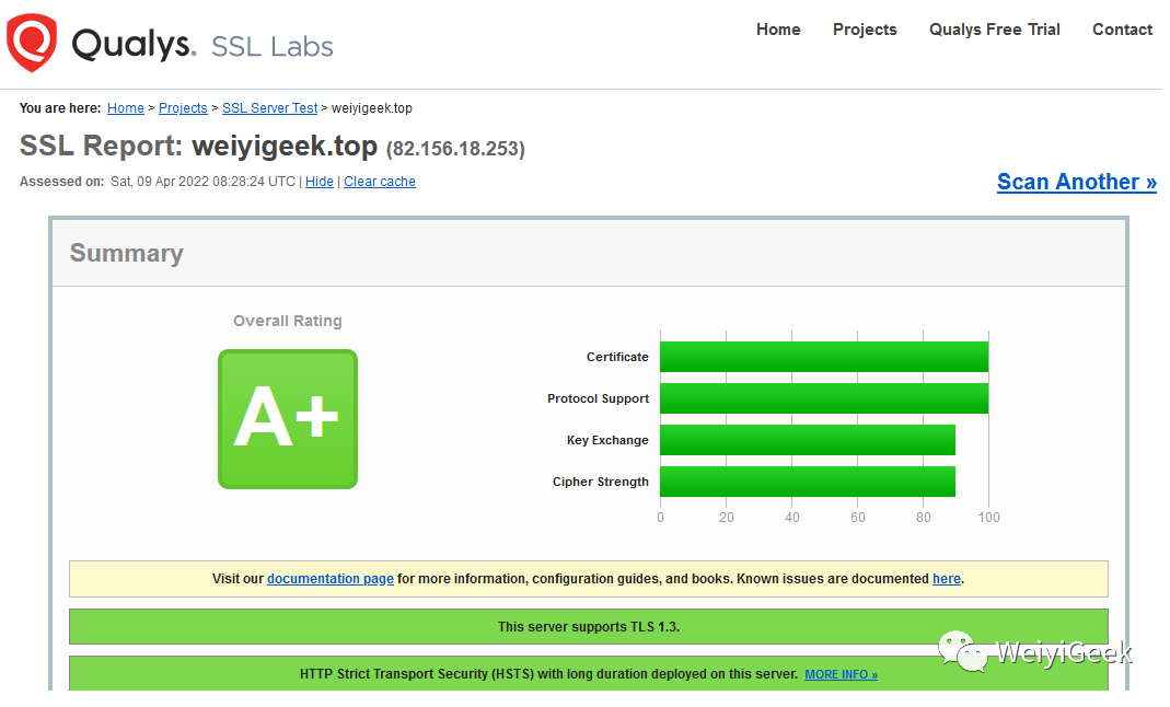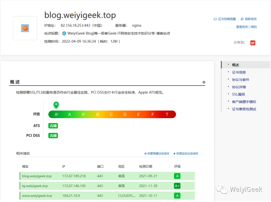 所以通常情况下我建议定期使用全面的 SSL/TLS 评估工具来验证您的配置,以确保您开始安全,对于公共网站建议您使用如下SSL实验室服务器进行站点https测试评估🍎。