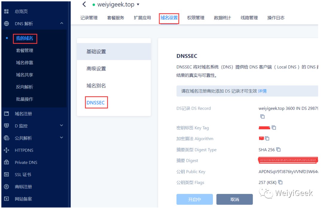 温馨提示: 目前只有少数注册商支持 DNSSEC ,如果您域名所在注册商不支持,可先将域名转入腾讯云,转入后方便一站管理,更可一键开启(带转入链接)