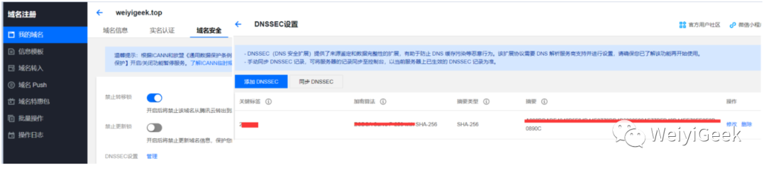 第三步: 查看验证DNSSEC是否配置成功, 此处仍然以腾讯云为例(我的域名在腾讯购买的没办法)。