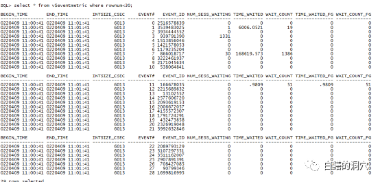 我们再回过头来看看Oracle的v$eventmetric视图,通过begin_time/end_time我们会发现,对于大多数EVENT,oracle记录的都是1分钟的采样周期内的情况。WAIT EVENT是一种瞬间发生的等待,在具体的性能分析工作中,长时间的累计值实际上并不重要,更为重要的是最近的情况,而1分钟的统计值十分有助于帮助DBA进行分析。哪怕存在一些特殊的异常值,通过观察几次一分钟的数值,就可以基本了解某个等待事件在此期间的异常情况。