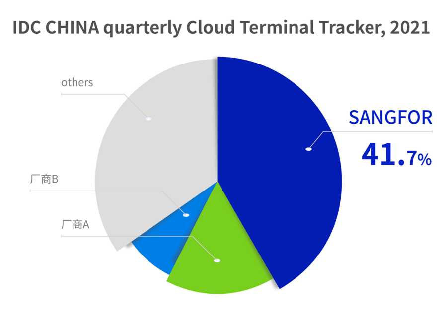 国际数据公司(IDC)发布《2021年Q4中国云终端市场追踪报告》,深信服桌面云终端再次位列第一。纵观2021年,深信服桌面云终端以全年41.7%的市场占有率稳居全国第一。
