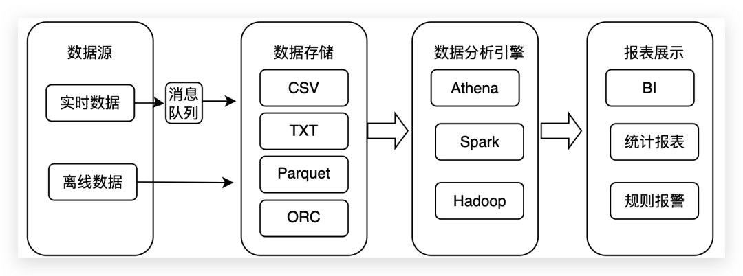 查询的时候通过Athena、Spark或者Hadoop进行查询分析。最终分析的数据用于BI、统计报表和告警规则等。
