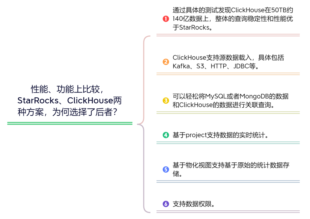 在StarRocks、ClickHouse这两种方案中,我们经过性能和功能上的比较,最终选择了ClickHouse。这里可能有人会想了,那为什么选择ClickHouse呢?主要原因有这几点。