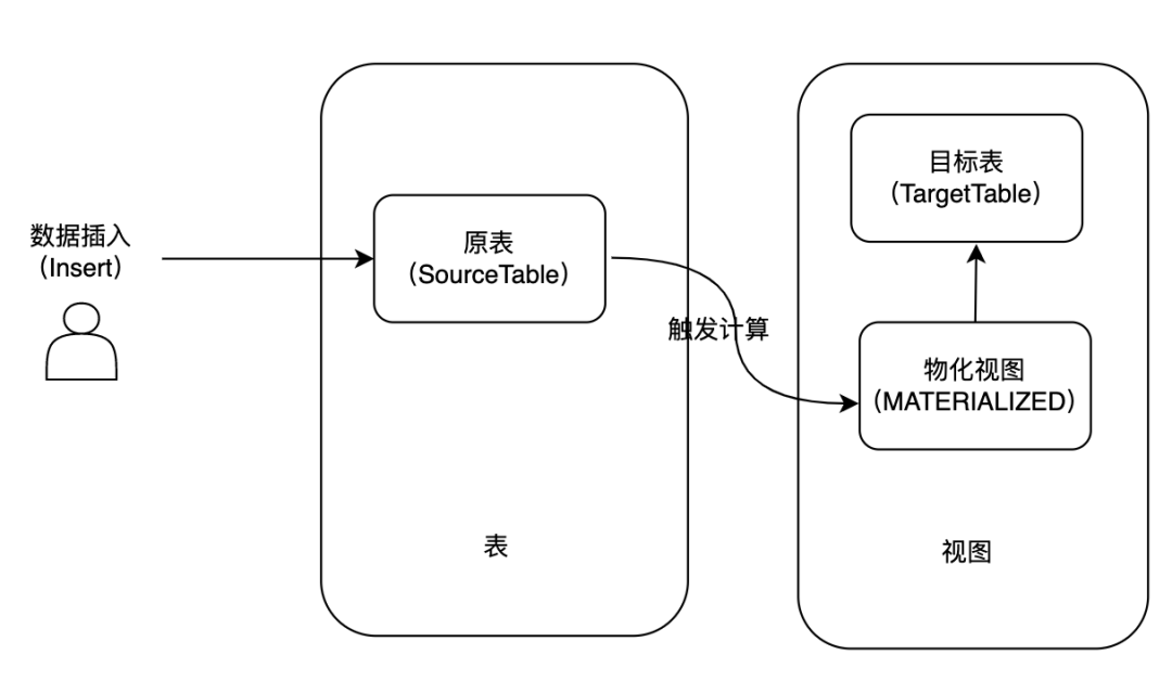 物化视图的构建过程中包括一个原表,一个物化视图和一个目标表。物化视图定义了数据物化的计算逻辑,当我们向原表插入一条数据时,会触发物化计算,计算完成后将计算结果实时写入目标表。用户查询的时候查询目标表即可完成数据的分析。