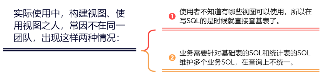 但是在实际的使用过程中,常常因为构建视图和使用视图的人不在一个团队,一种情况是使用者不知道有哪些视图可以使用,所以在写SQL的是时候就直接查基表了,另外一种情况是业务需要针对基础表的SQL和统计表的SQL维护多个业务SQL,在查询上不统一。