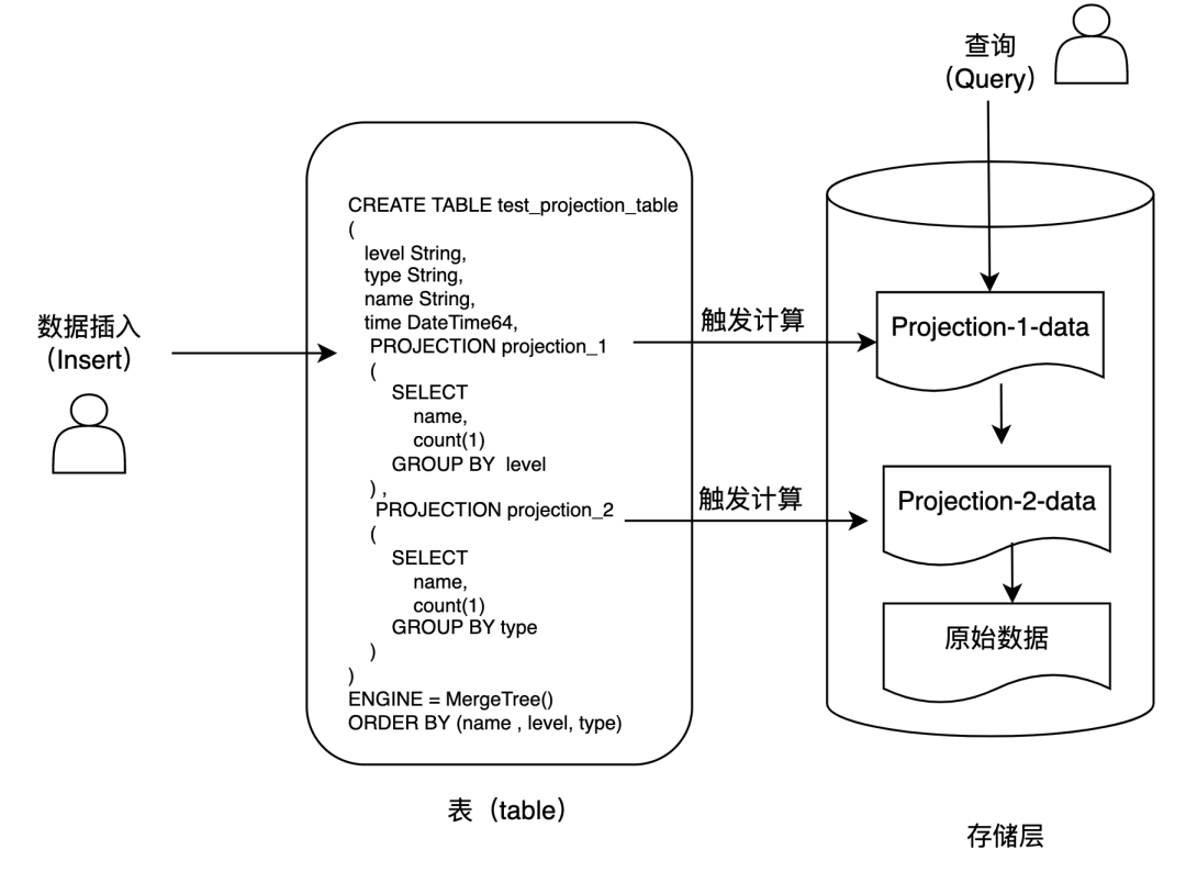 projection在数据分析功能上类似于物化视图,我们可以在projection中预定义表达式,当数据写入的时候,会将原始数据和针对projection中表达式计算后的聚合数据一起写入存储。