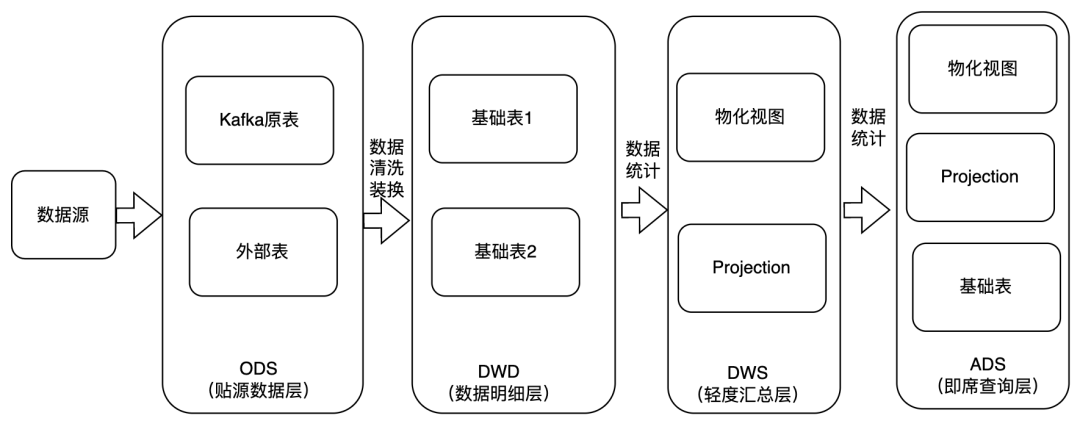 其实在该架构中,可以将接入Kafka原表和外部表的数据理解为ODS(贴源数据层),将经过数据清洗转换后的基础表理解为DWD(数据明细层),将基于基础表衍生的物化视图和projection等统计数据理解为DWS(轻度汇总层),基于视图我们还可以接着构建视图,表和projection。