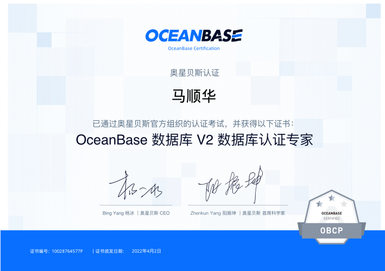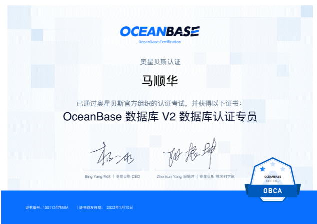推荐考个OceanBase的认证,尤其是OBCA 是免费的,可以到网站上https://oceanbase.com去考一下,在官方文档和老师的带领下通过认证快速了解入门