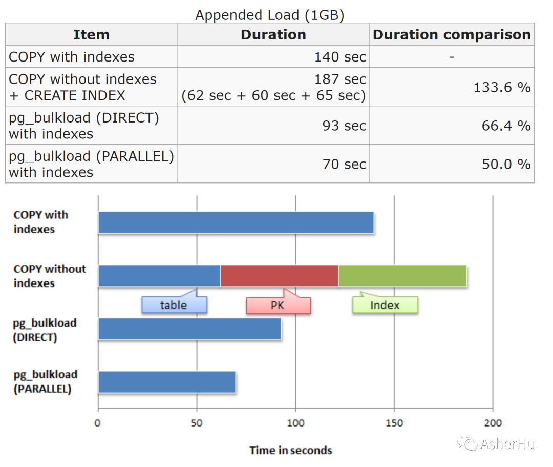 1.PostgreSQL 参数 maintenance_work_mem 会影响 pg_bulkload 的性能。如果将此参数从 64 MB 更改为 1 GB,则持续时间将缩短近 15%。