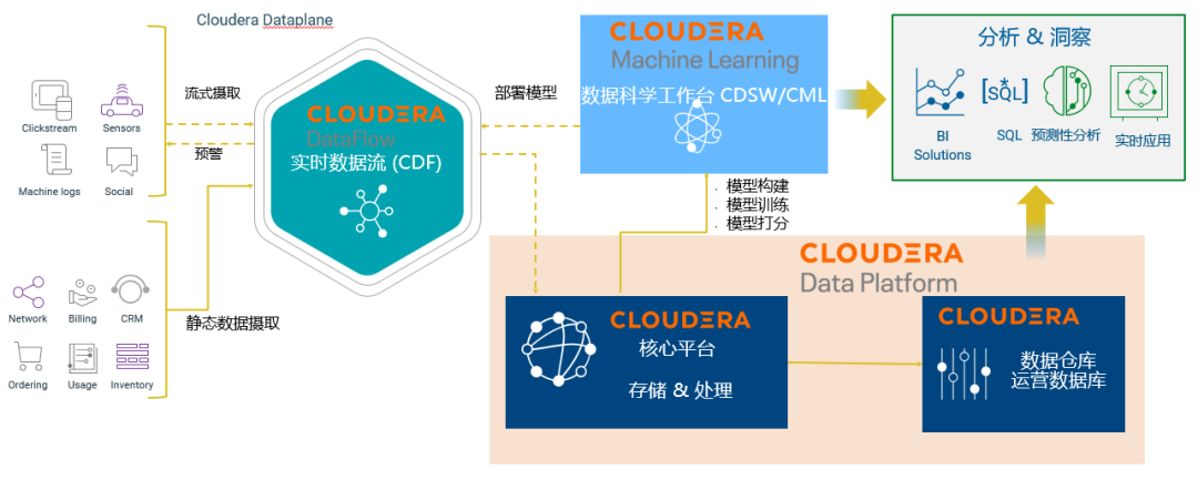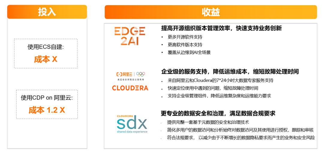 阿里云与 Cloudera 联合打造了阿里云上的半托管形态 CDP企业数据云平台,以及基于 On- Premise 部署的 CDP大数据平台、CDF流计算、CDSW机器学习平台的专有云输出。该平台可以灵活地运⾏各种企业⼯作负载,⽀持从边缘计算到⼈⼯智能的多功能数据分析,提供企业级的安全模型来保证客户数据安全。