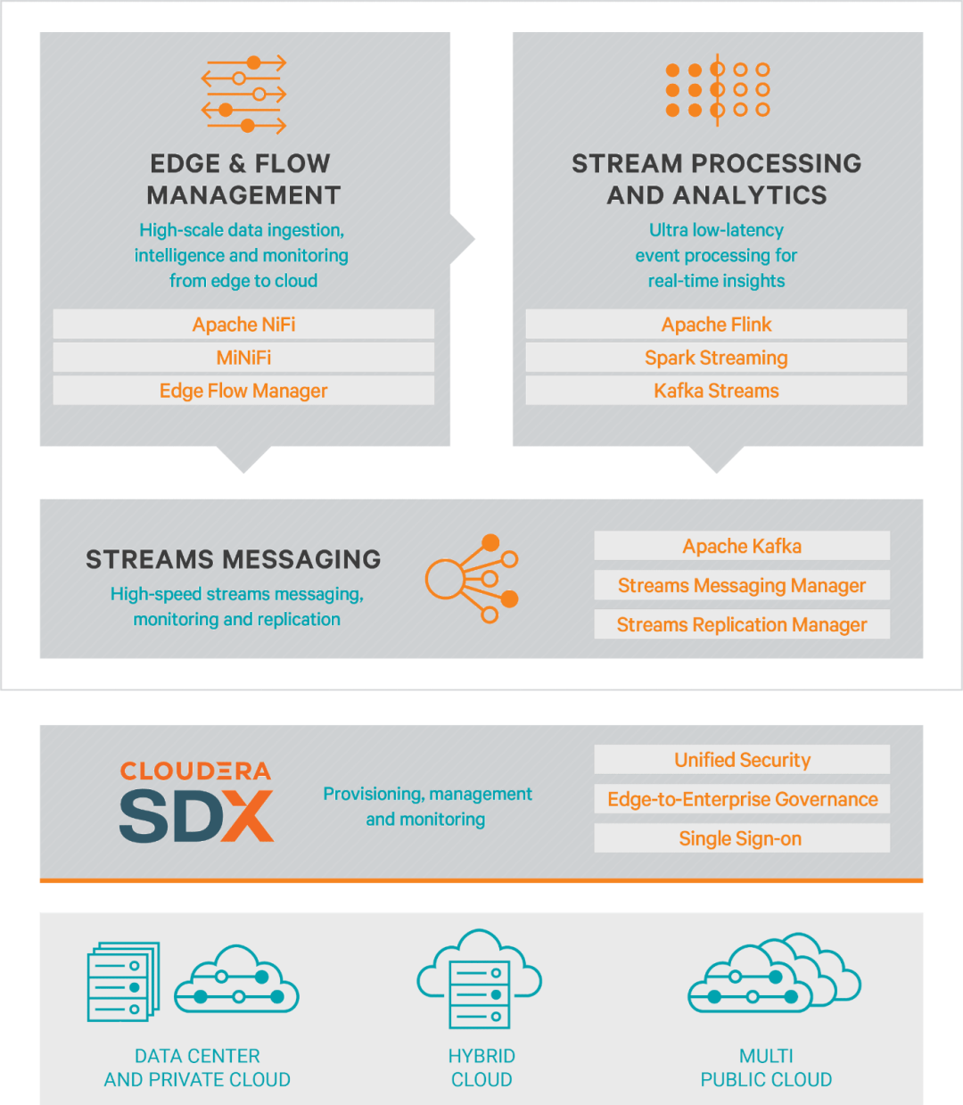 由 Apache Kafka 提供支持的面向企业和云的企业级消息传递解决方案。Streams Messaging Manager 用于监控/管理集群,Streams Replication Manager 用于 HA/DR 部署,Kafka Connect 用于集成,Cruise Control 用于管理和平衡 Kafka 集群。