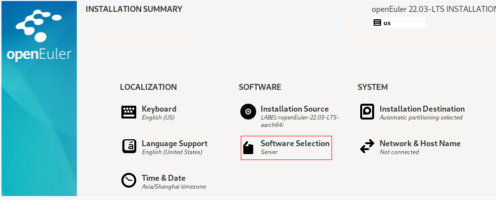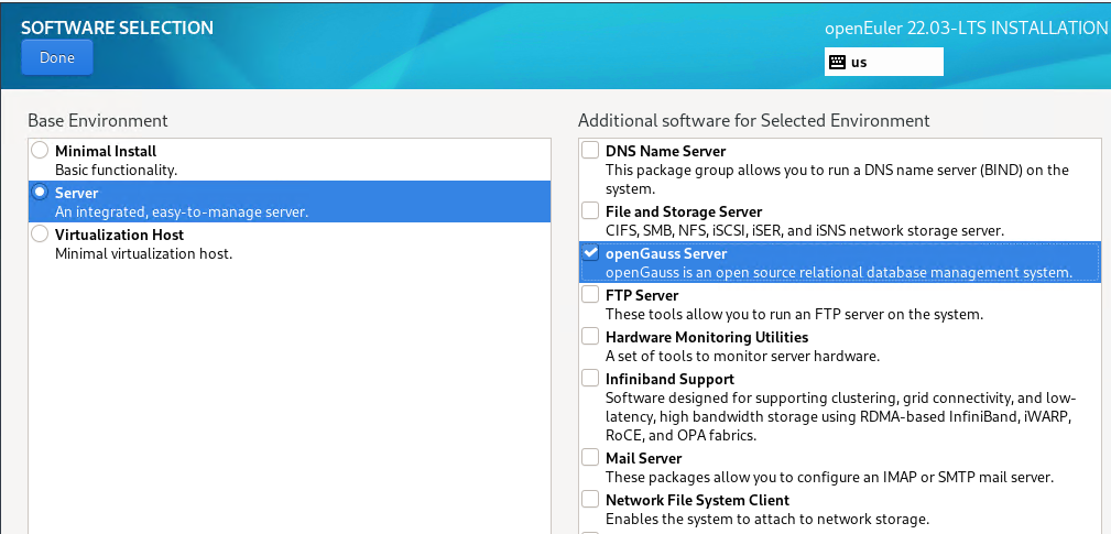 在使用openEuler 22.03 LTS ISO镜像安装操作系统时候,安装引导界面的选择软件包里面勾选上openGauss Server,在安装完成操作系统后,便会默认安装上openGauss数据库并启动单机数据库进程。