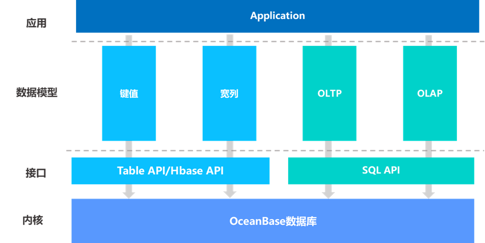 OceanBase 目前在 SQL 层面已经支持兼容 MySQL 语法协议的关系型 SQL API;在存储引擎层面,通过 Table API 提供表模型和 HBase 模型的 NoSQL 能力,并在此之上接入多种兼容性服务,实现一个 OceanBase 数据库,支持多种数据模型。