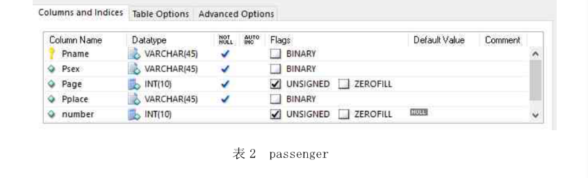 在passenger表中,有两个属性列,分别为:Pname(姓名),Psex(性别),Page(年龄),Pplace(籍贯),number(电话号码)。