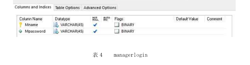 在mangerlogin表中,有七个属性列,分别为:Mname(管理员姓名),Mpassword(密码)。