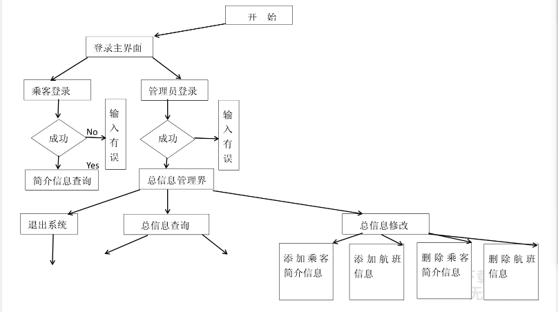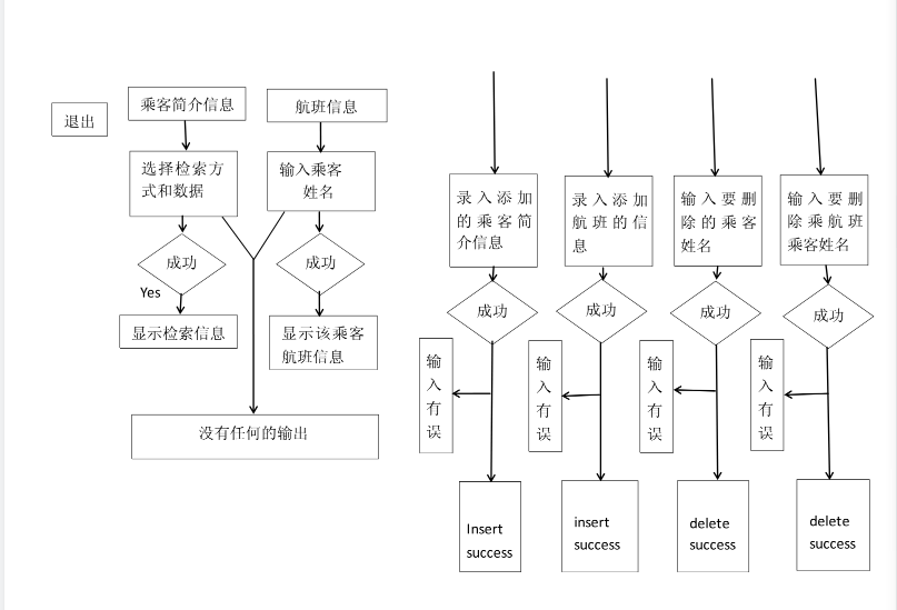 管理员方面:管理员通过自己的密码登入后可以选择:查询功能、文件功能、修改功能。在查询功能里面,可以选择是查询乘客简介基本信息,还是航班信息。在查询航班信息时,可以从依据不同字段,即简介表中的不同属性进行查找。在查找航班信息时,只能依据姓名进行查找。在修改功能里面,包括对航班信息表和乘客表进行增加和删除记录