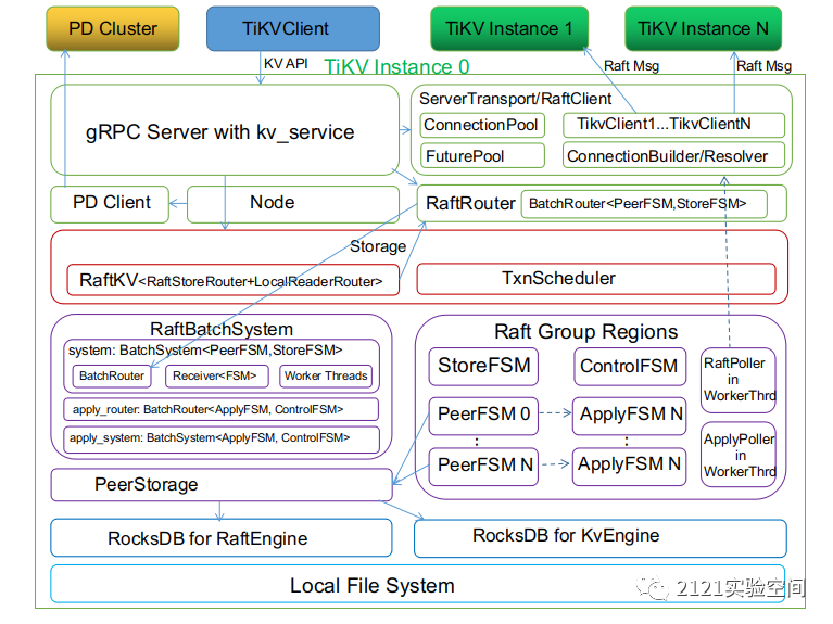 TiKV的实现可分为API接口层Server/RaftClient、事务支撑层Storage、共识/算法层RaftBatchSystem/RaftGroup Regions、数据存储层RaftEngine/KvEngine,如下图所示: