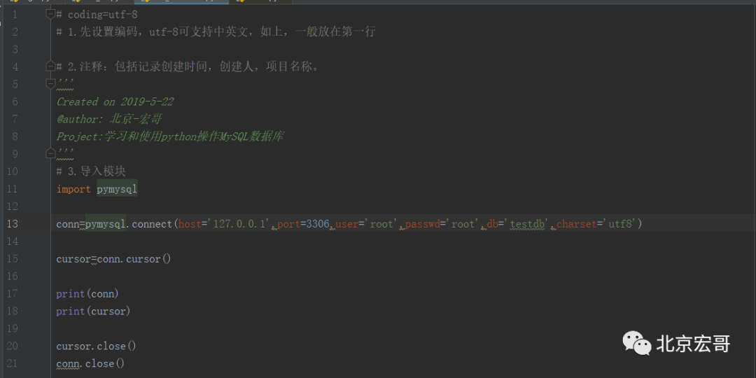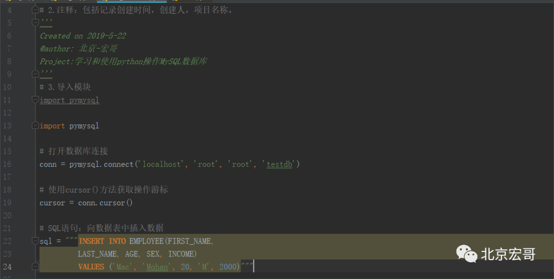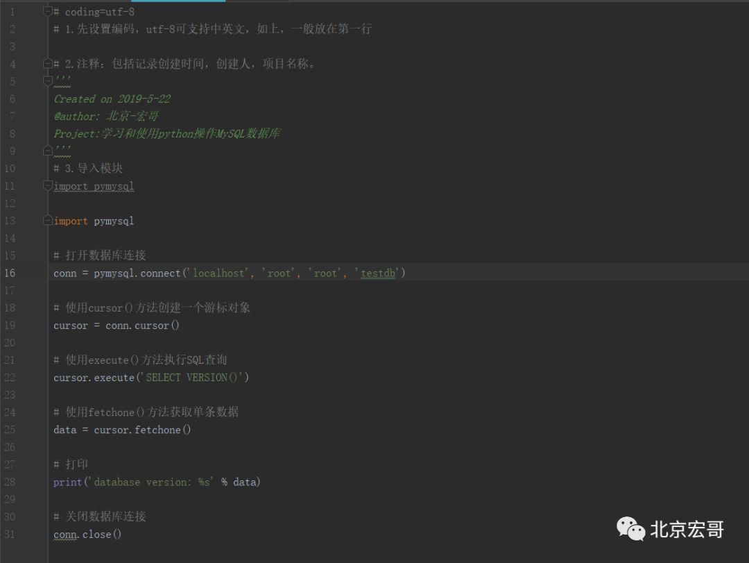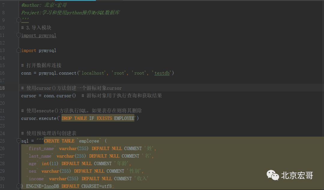 下面将以具体代码的形式依次介绍python中如何实现对MySQL数据库的增删改查等操作。