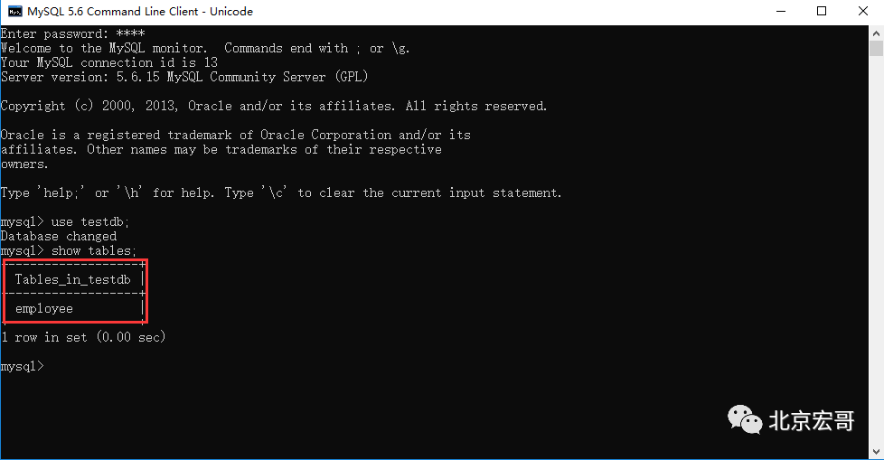 4、查看TESTDB数据库里,有没有EMPLOYEE(测试用的测试表),输入命令: