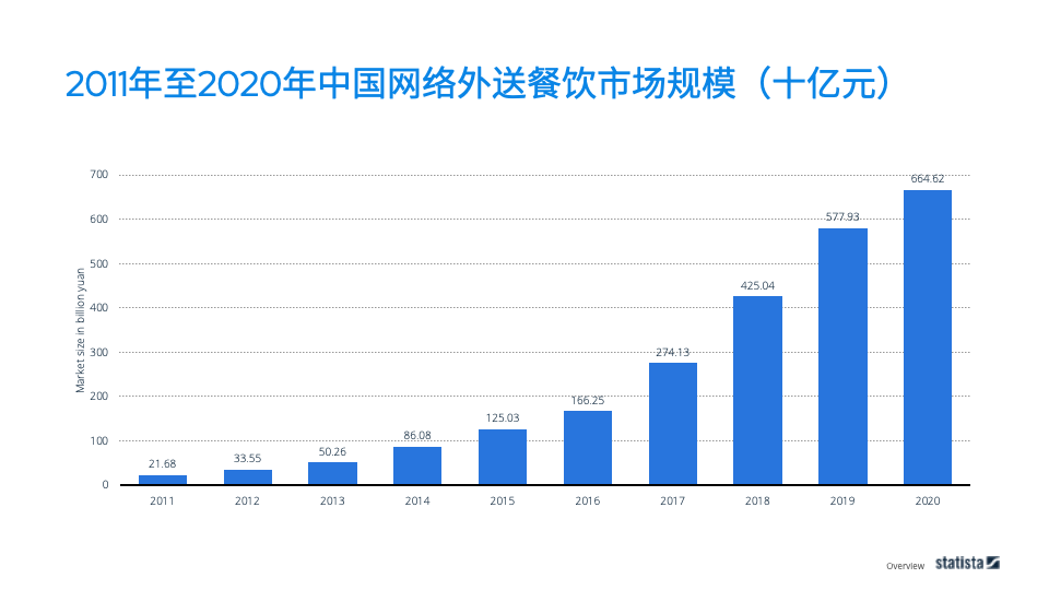2020年受疫情影响,餐饮商户纷纷投身外卖业务,线上外卖平台活跃商户数持续上升。根据 Statista 统计数据,2020 年中国网络外送餐饮市场规模超过 6646.2 亿人民币。同时,据 CNNIC 报告,2021 年我国网上外卖用户总规模已高达 4.7 亿。
