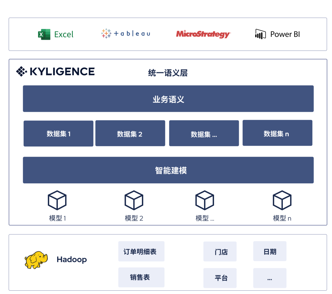 统一业务语义+统一权限:通过 Kyligence 关联多个多维模型,统一定义维度、指标,提供业务友好的统一语义数据集;并提供行列、数据集、维度、指标多级别的权限管控;