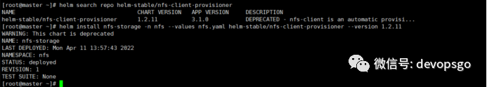 [root@master ~]# helm install nfs-storage -n nfs --values nfs.yaml helm-stable/nfs-client-provisioner --version 1.2.11