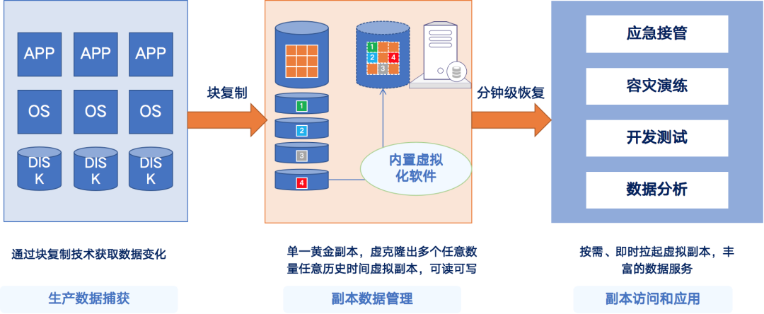 英方整机 CDM 采用块复制技术,通过建立一个完整的整机系统副本拷贝,实现生产主机数据或系统更新时,进行数据块级别的实时变化同步。副本数据支持整机的容灾接管、生产测试开发、自动化容灾演练等功能。此外,方案还可以实现整机的历史恢复。