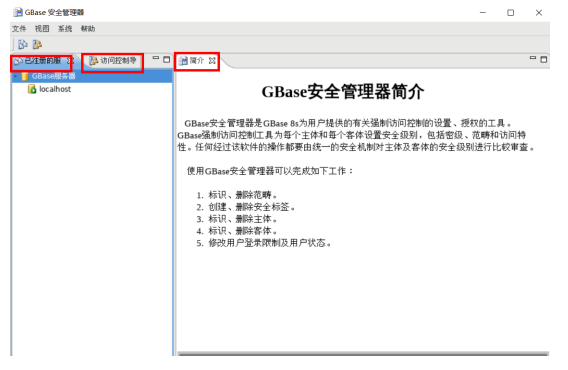 访问控制导航是GBase安全管理器的管理组件,它提供了五个与安全配置有关的视图。