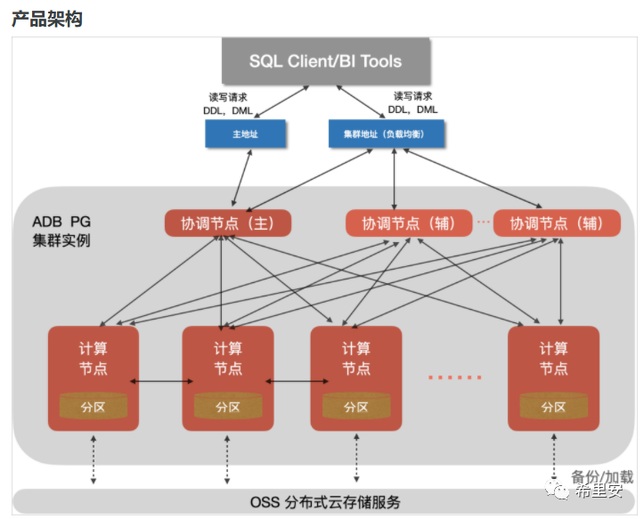 计算节点(Compute Groups)作用有:全并行分析计算,数据分区双副本存储,定期自动备份至OSS(分布式云存储服务)。计算节点增加,可以水平提升存储容量,这个并从查询能力很强,在TPC-H 30TB级别基准评测中,它是第一名。