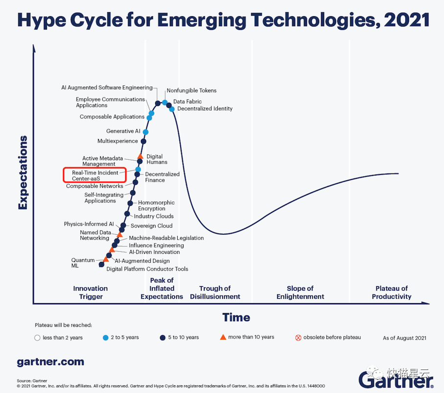 在数据应收尽收的背景下,数据多,如果缺乏有效的洞察手段和数据处理手段,那么数据多反而会变成一种干扰和负担。如何提供全局统一的数据视图,建立有效的信息系统,把知识沉淀、赋能,对于监控产品的用户可以发挥更大价值。Real-Time Intelligent Incident Center 是搭建该信息系统的一个有效手段。Gartner 在 Hyper Cycle for Emerging Technologies, 2021 中,也对此做出了预测,Real-Time Incident Center 将在未来的 2 到 5 年到达成熟期。体验优秀的交互设计和Web UI,对于扩大用户使用群体,降低系统的使用门槛帮助很大,也能够有效减少监控产品维护人员的客服成本,但是也容易被工程师诟病这种 ClickOps 的方式效率太低,不利用自动化、缺乏重复执行的一致性。在工程师的群体内,对于云计算资源/服务的申请、使用、销毁等工作,以 git pull-request 来追踪版本变化和 change review,以 pipeline 高度自动化运行,正在成为一种更高效和流行的文化,OaC 就是监控在这个流行趋势的产物之一,这背后是靠监控产品良好的 API 抽象所驱动的。Terraform 开源项目作为目前 IaC 领域的事实标准,本质上相当于把各个云所提供的能力和服务,透过其 API,换了一种形式,以 code 的方式方法,对其进行了表达和管理。code 最大的优势是一次编写,可重复的运行并保证一致性,这使得对于 infra 和相关服务的上下线、扩缩容、加减配置、修改监控等操作,都可以高度自动化。监控系统自身的部署架构是否支持容器化,以 binary、sidecar、daemonset 等多种方式运行,是否支持 opentelemetry open metrics 相关标准,是否支持 service discovery,是否兼容 PromQL 等 Query Language,是否可以方便的通过 docker-compose、helm chart、k8s operator 等方式运行管理。这些都是作为一个云原生监控系统本身要先自我革新的方面。如前所述,Prometheus 虽然已成为该领域的实施标准。但是,Prometheus 重心是在定标准,打造基础能力,构建生态,这个定位和认知,无限加强了其在监控的基础能力和标准层面的影响力,但也制约了其在企业级产品化方向上的发展,肌肉记忆造成的强大惯性使然。Prometheus 在企业级监控的产品特性上,仍然有很大的痛点至今未被很好的满足,比如入门门槛高易用性的问题,扩展性的问题,企业较大范围用户使用时协同的问题,all-in-one开箱即用的问题等等。经过 Open-Falcon 的经验积累和认知迭代,结合云原生监控的趋势特点分析,我们和滴滴技术同学推出了企业级云原生监控系统 Nightingale v5 开源新版本(https://github.com/didi/nightingale),重点聚焦在云原生场景,在 Prometheus 的生态基础上,重点加强其企业级特性提升、产品化的创新以及解决方案的落地。简而言之,如果在架构云原生监控的过程中,有以下的一个或多个困扰,那么请毫不犹豫的联系我们一起探讨:
