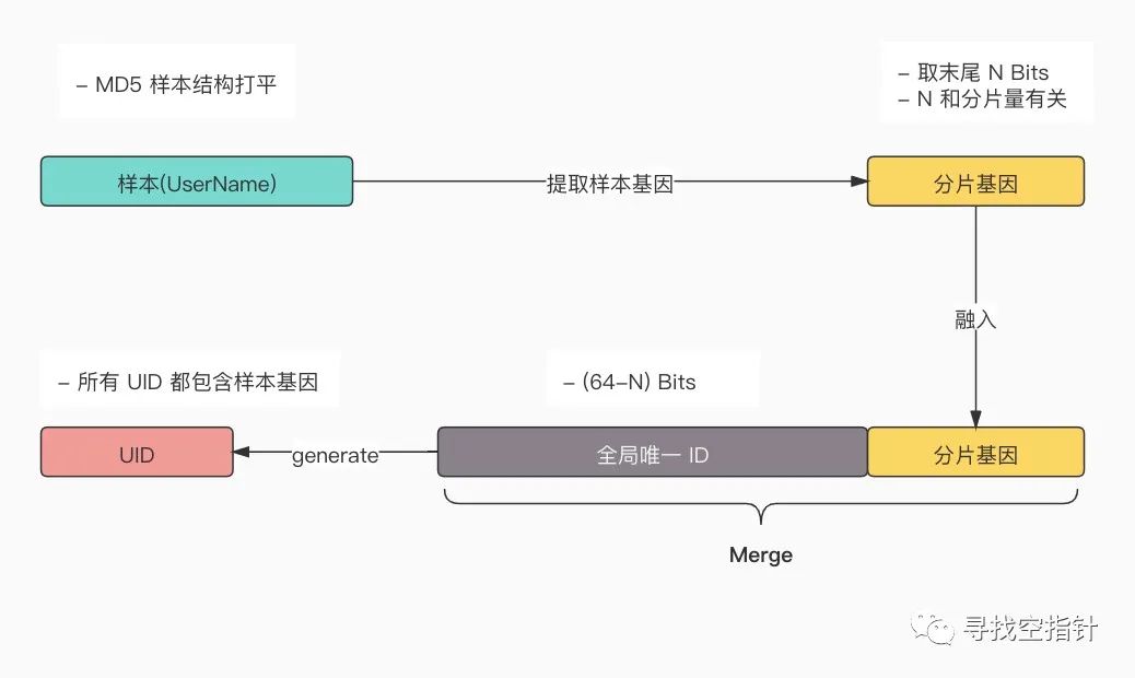 所谓基因算法就是提取 username的分片基因,合并到全局唯一的 ID 上,生成一个全新的 UID。如下图:
