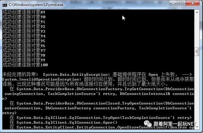 当创建到101个连接的时候,就无法再创建新连接了。也就是说,如果连接字符串不做任何处理,我们的程序只能够跟SQLServer建立101个连接。测试结果截图如下:
