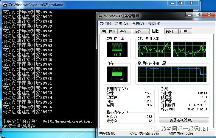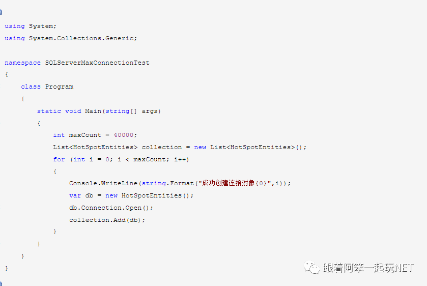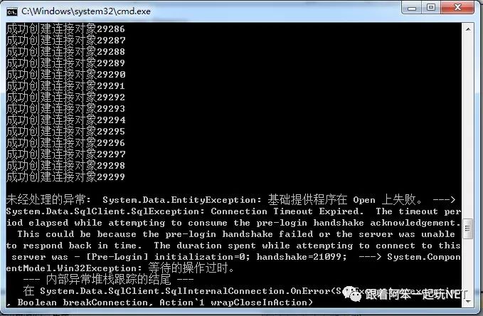 当创建到101个连接的时候,就无法再创建新连接了。也就是说,如果连接字符串不做任何处理,我们的程序只能够跟SQLServer建立101个连接。测试结果截图如下: