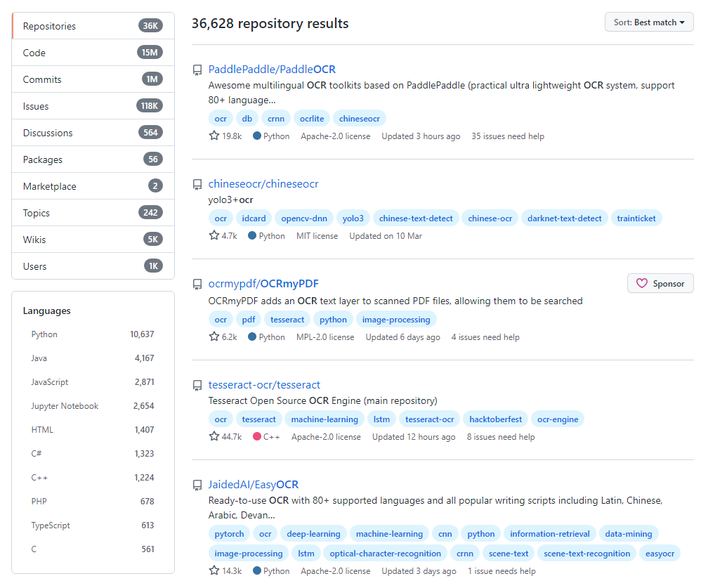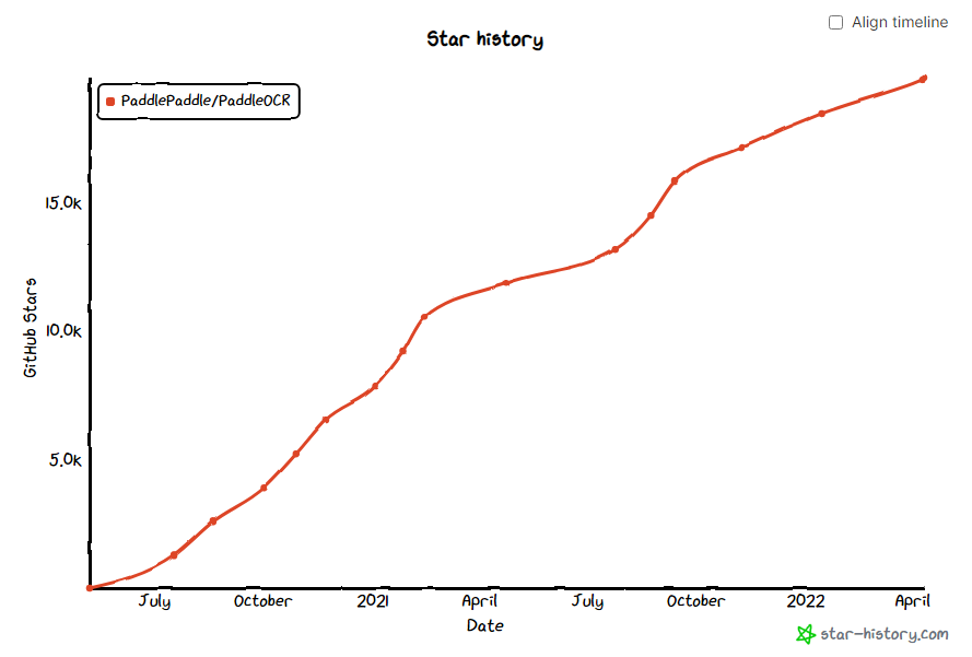 回到主题,文章中他说的用的是现成的OCR库,再加上用的Python,推测应该是PaddleOCR(https://github.com/PaddlePaddle/PaddleOCR),从GitHub上的star能看出他的关注度还是很猛的,