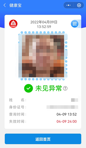 result: LS N 明 冬 jD{30% 匮 I 13:53〈 健 康 宝 … @2022 年 04 月 09 日一 13:52:59@ @ @ @ @ 8 @ @ @ 白 白 @...(为了安全,屏蔽一些内容)吴 严 绍“ 白@ G 8 8 8 8 8 日 @ @ @ @巳 t园 未 见 异 常 e姓 。名 : XXX查 询 时 间 : 04-09 13:52失 效 时 间 : 04-09 24:00