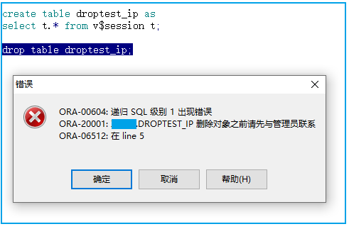 CREATE OR REPLACE Trigger TRG_DDL_DENY_DROPBefore Drop Or Truncate On DatabaseDeclarel_Errmsg Varchar2(100) := '删除对象之前请先与管理员联系';BeginIf Ora_Sysevent = 'DROP' And Ora_Dict_Obj_Owner ='YOURDB' ThenRaise_Application_Error(-20001, Ora_Dict_Obj_Owner || '.' || Ora_Dict_Obj_Name || ' ' || l_Errmsg);End If;ExceptionWhen No_Data_Found ThenNull;End;