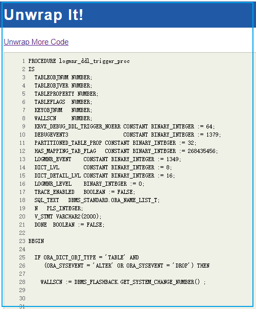 我们需要对其 unwrap 触密。wrap 是 Oracle 提供的加密工具,Oracle 并未提供 unwrap 工具。使用 wrap 并不能达到保护代码安全的目的,网上有线上 unwrap 工具可以用,我提供两个: