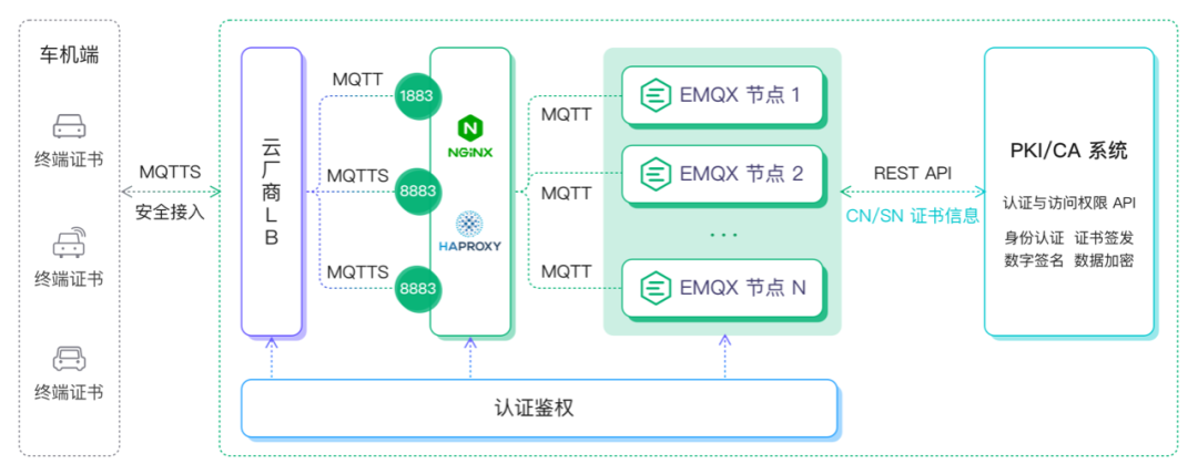 在云端我们可以选择在云厂商的负载均衡产品、基于 Nginx/HAProxy 自行搭建的 LB 层或是 MQTT Broker 层进行认证鉴权,同时通过 proxy_protocol v2 将车机端的 ID 信息、用户名密码及证书的 CN/SN 等信息通过调用 PKI/CA 统一认证接口进行唯一性认证,实现一机一密或一型一密的安全认证。