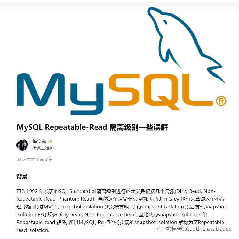 对这个问题的思考起源于一篇文字,文字中针对 MYSQL的隔离级别中的实现的问题进行了说明 MySQL Repeatable-Read 隔离级别一些误解 - 知乎 (zhihu.com) ,里面写的很详细,这里就不在详述了,感兴趣的同学可以去看,很涨知识,例如我,因为读了这篇文字,对于 PG MYSQL 在MVCC 的实现的问题,有了更深的认知。顺便说一句,写这篇文字的同学是阿里云POLARDB 的数据库开发者。https://zhuanlan.zhihu.com/p/402008512