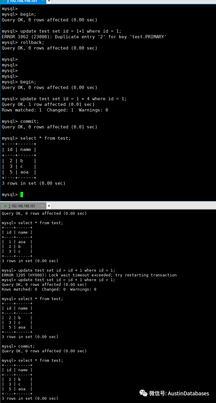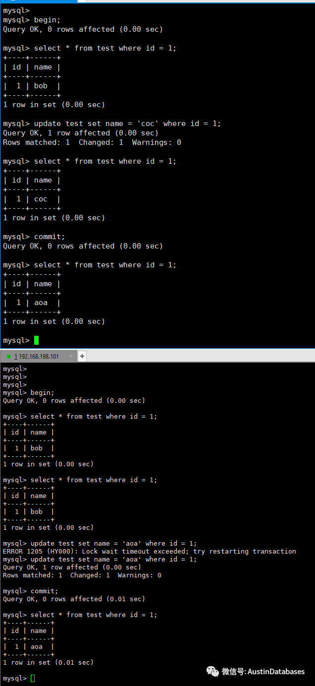 具体的操作过程,我们可以发现整体的操作过程中,MYSQL 虽然通过锁超时的方式,在 SESSION 1 并未commit 前阻止了 SESSION 2 的commit ,但是SESSION 1 COMMIT 后,SESSION 2 就可以进行COMMIT ,