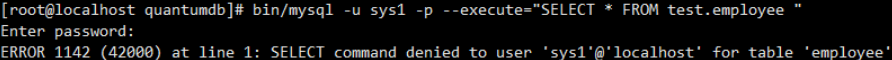 mysql -u sys1 -p --execute="SELECT security_label,count(*) FROM protected.employee group by security_label"