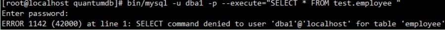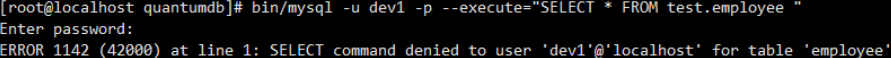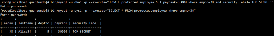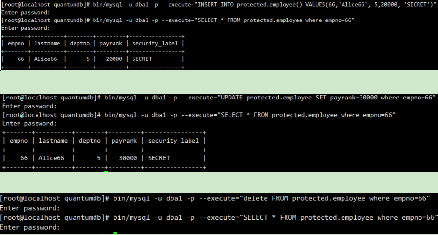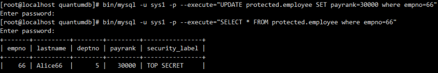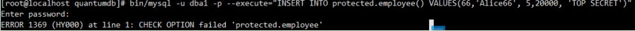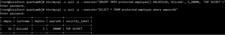 bin/mysql -u dev1 -p --execute="INSERT INTO protected.employee() VALUES(66,'Alice66', 5,20000, 'CONFIDENTIAL')"